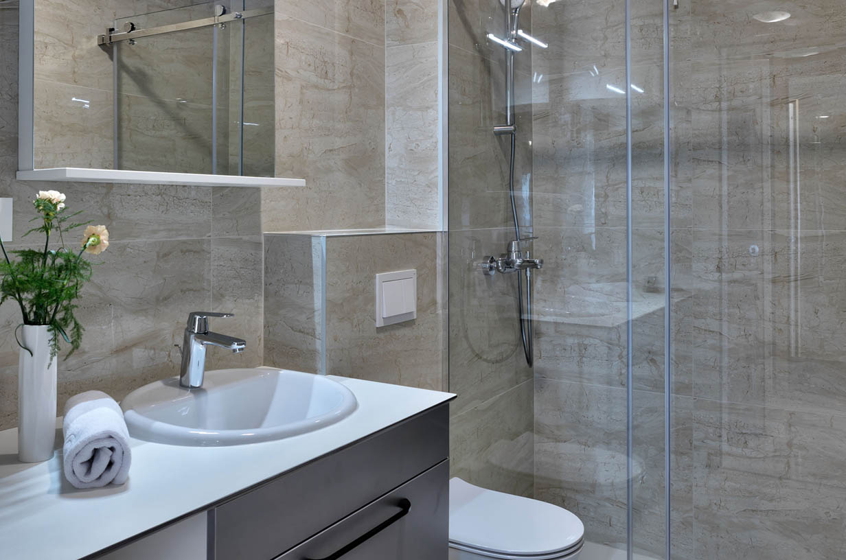 All bathrooms in Amara apartments have modern and spacious shower cabins with modern shower and massage systems. In addition, towels are changed daily. Additional equipment includes a hair dryer.
